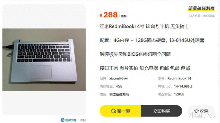 居然还能看到288块包邮的笔记本?而且还是红米牌的。没错,就是在二手鱼里刷到的。一台RedmiBook 14,i3 8代处理器,4+128G配置,但注意是“无头骑士”。啥叫无头骑士?就是屏幕没了,只剩下主机下半身了。那么这价格值得入手吗?一起看看这到底是个啥情况。