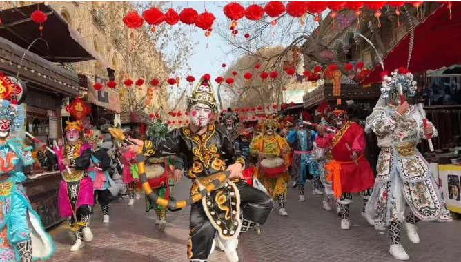 喀什古城景区内的英歌舞饰演。喀什市融媒体中心记者艾孜海尔摄