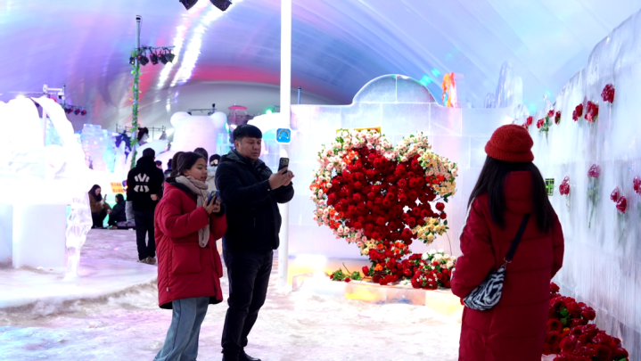 搭客在疏附县丝路明珠四季冰雪大寰宇拍照打卡。疏附县融媒体中心供图