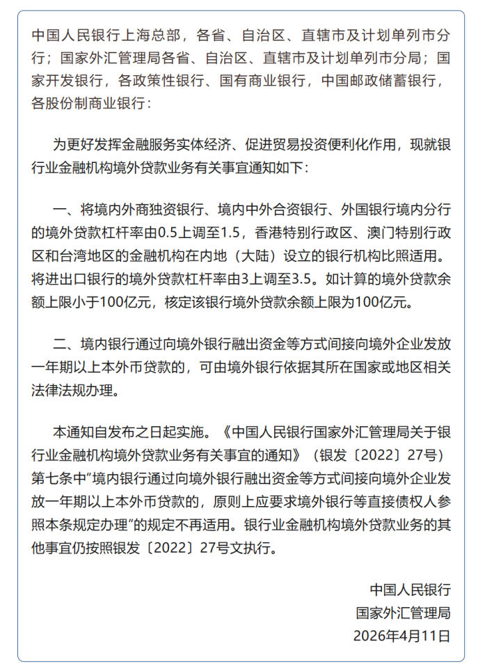 据中国东谈主民银行微信公众号15日音信,中国东谈主民银行、国度外汇惩办局日前发布对于调治银行业金融机构境外贷款业务联系事宜的见知。