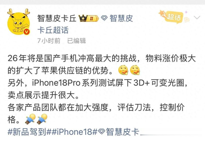 数码博主"智慧皮卡丘"在微博爆料称,2026年将是国产手机冲击高端市场的最大挑战年,物料成本大幅上涨显著扩大了苹果供应链的优势。同时,iPhone 18 Pro系列正在测试屏下3D+可变光圈等新技术,产品卖点提升明显。面对成本压力,各家厂商产品团队都在加大评估力度,通过"刀法"控制价格。这一系列动态,勾勒出2026年手机行业竞争格局的微妙变化。