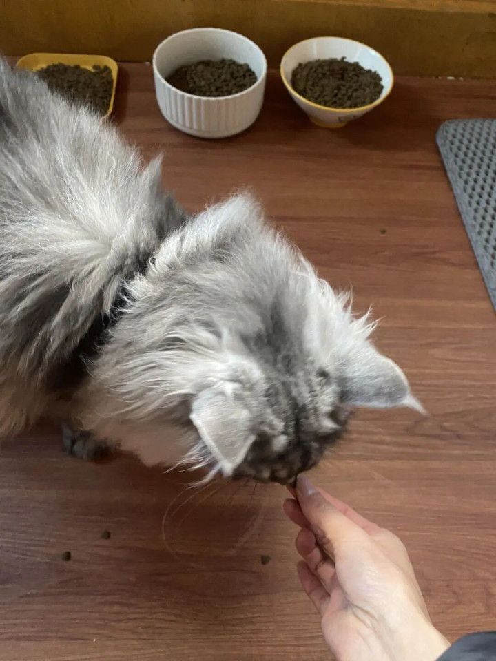 “多多,多多,我给你带了适口的哦。”徐女士戴上鞋套,一边喊着猫咪的名字,一边拿出猫条去喂它。