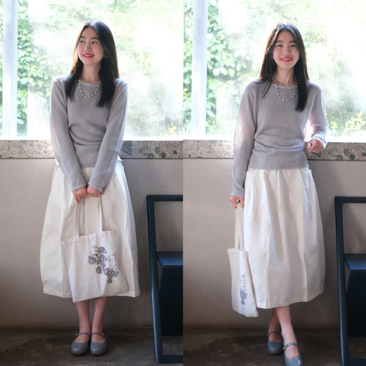 在韩系穿搭中,毛衣是她们凹造型的利器,遴荐勤俭的版型,更能打造高档噶,灰色圆领毛衣搭配白色蓬蓬裙,灰绿色玛丽珍鞋加多密致感,脖子用一条珍珠项链点缀,提亮造型又衬肤色。