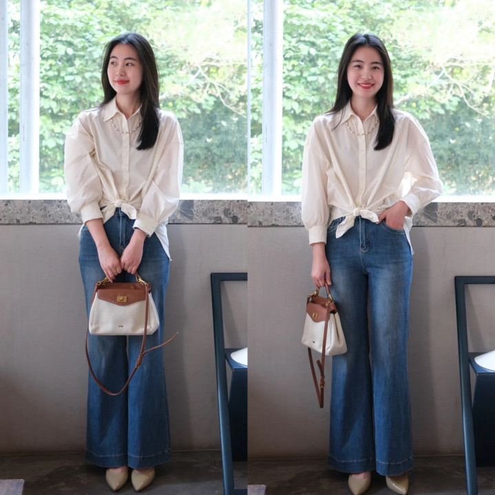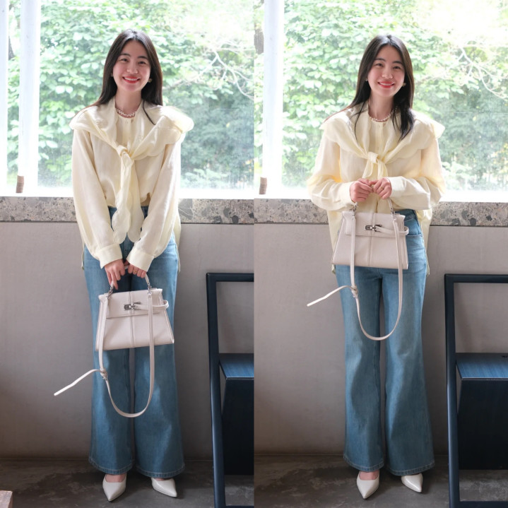 虽然,除了基础款的衬衫,一些带有小蓄意的衬衫项目亦然韩系穿搭比拟常见的穿搭组合哦!黄色雪纺衬衫,加上小披肩的蓄意,与浅蓝色微喇牛仔裤搭配,尖头平底鞋加持,简直超等和煦。