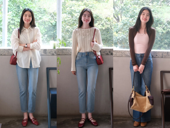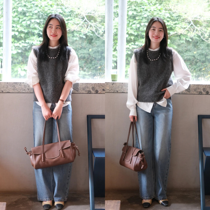 韩系穿搭中,她们十分善于叠穿,学院风穿搭最常见,灰色毛衣马甲叠穿白色衬衫,蓝色牛仔直筒裤,超等斯文又减龄。