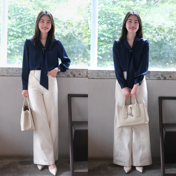 深蓝色飘带衬衫自带优雅气质,灵动飘带增添几分柔好意思狂放。搭配米白色高腰阔腿裤,澄莹干净又显腿长,削弱打造出好比例。再配上一对尖头鞋,延长腿部线条,更显密致干练。合座穿搭勤俭大气,尽显职场女性的知性魔力。