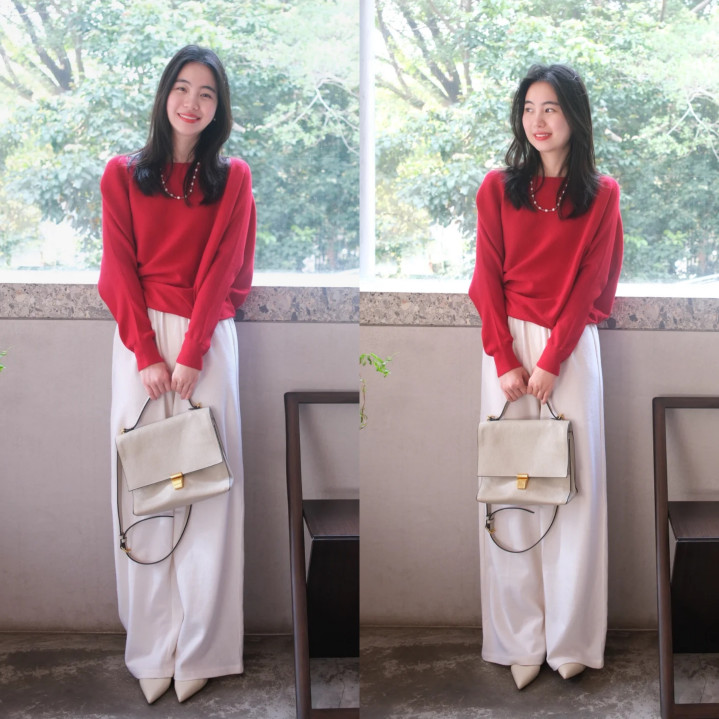 思让造型深广又高档,不妨试试彩色单品。选一件红色毛衣,良善亮眼,下摆松驰塞进白色高腰阔腿裤,突显腰线又显腿长。搭配米色手提包增添密致感,再踩上一对尖头鞋,延长腿部线条,合座穿搭优雅大气,削弱成为东说念主群焦点。