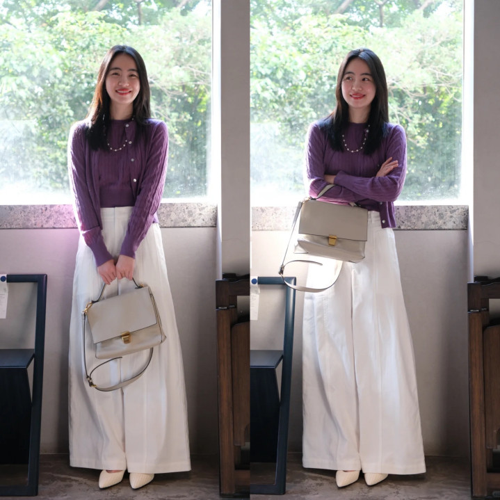 紫色自带和煦狂放韵味,选一套紫色小开衫套装,尽显优雅气质。搭配白色高腰阔腿裤,澄莹干净又拉长腿部比例。脚蹬尖头平底鞋,密致又景观,还能在视觉上进一步延长腿长。合座穿搭勤俭高档,削弱营造出温婉大气的春日氛围。