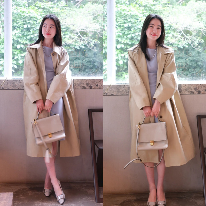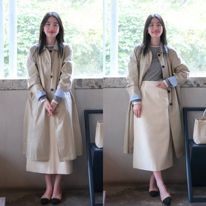 内搭灰蓝色连衣裙,和煦又静谧,颜色过渡当然和谐。二者搭配,刚柔并济,既有风衣的利落飒爽,又不失连衣裙的柔好意思狂放,削弱打造春日高档氛围感。