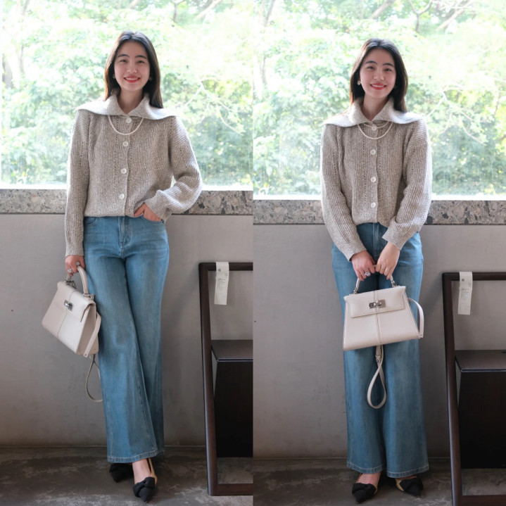 韩系穿搭里至意开衫是常客,灰色至意开衫配舟师领蓄意,别致又吸睛,尽显俏皮。搭配蓝色高腰微喇牛仔裤,修饰腿型还显腿长。玄色尖头鞋增添密致感,米色手提包和煦大气。合座造型勤俭前锋,削弱拿捏韩范氛围感。