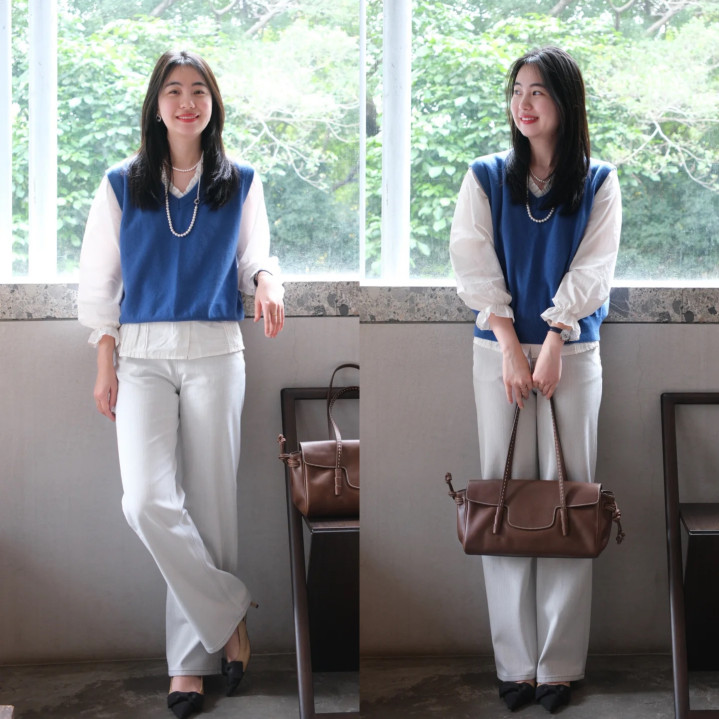 这套蓝色毛衣马甲与白色衬衫叠穿,下半身相连同色系的逍遥直筒裤,韩系春日氛围感成功拉满!