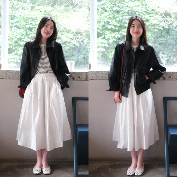 短夹克是韩系穿搭利器,选玄色皮夹克酷帅有型,内搭瑕瑜条纹衫经典又吸睛。搭配白色高腰伞裙,进步腰线显腿长,还添几分甜好意思。脚蹬波点浅口鞋,俏皮感十足。整躯壳调甜酷交汇,削弱打造出前锋又减龄的韩系氛围。