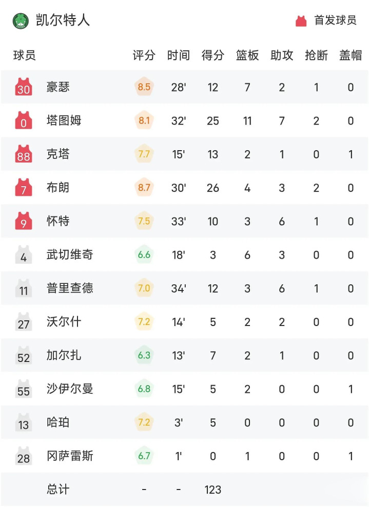凯尔特东说念主(1-0):布朗26分4板3助2断、塔图姆25分11板7助2断、奎塔13分2板1助、豪泽12分7板2助、普理查德12分3板6助、怀特10分3板6助、加尔扎7分2板1助、沃尔什5分2板2助、谢尔曼5分2板、哈珀5分、武切维奇3分6板3助、冈萨雷斯1板