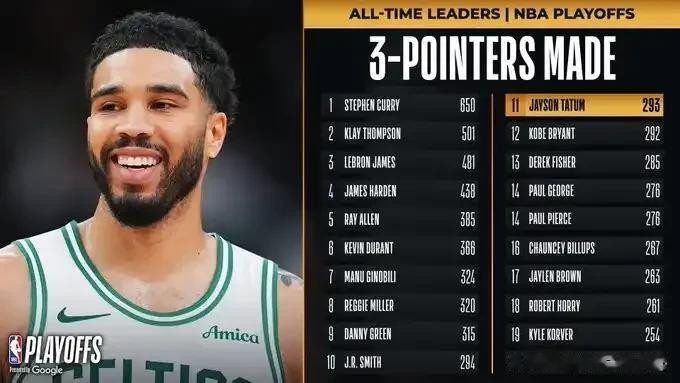 次节比赛,塔图姆外线手起刀落,投中了个东说念主季后赛糊口的第293粒三分球。凭借此球,他得当越过科比,跃升至NBA季后赛历史三分榜第11位。半场战罢,塔图姆手感火热,11投7中,砍下21分8篮板4助攻2抢断。科比记载就此被无意!