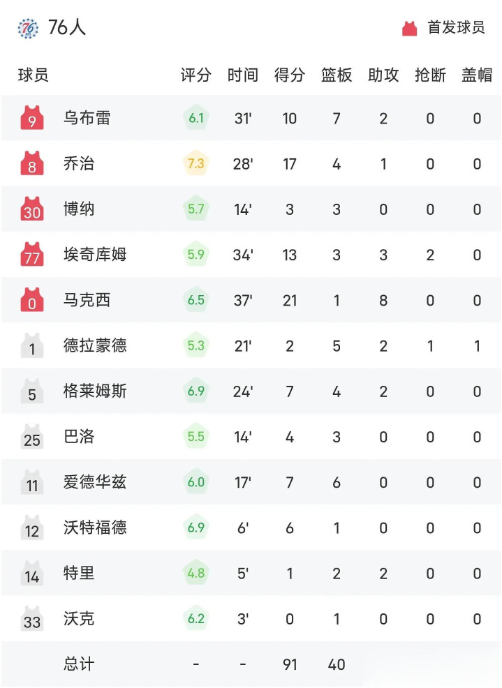 76东说念主(0-1):马克西21分1板8助、乔治17分4板1助、埃奇库姆13分3板3助2断、乌布雷10分7板2助、爱德华兹7分6板、格莱姆斯7分4板2助、沃特福德6分1板、巴洛4分3板、博纳3分3板、德拉蒙德2分5板2助、特里1分2板2助、沃克1板斗鱼app注册